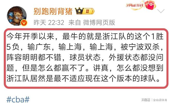 賽后,媒體人別跑剛背豬社媒發(fā)文點(diǎn)評(píng)了浙江男籃本賽季的表現(xiàn):“今年開季以來,最牛的就是浙江隊(duì)的這個(gè)1勝5負(fù),輸,輸上海,輸上海,被寧波雙殺,陣容明明都不錯(cuò),球員狀態(tài),外援狀態(tài)都沒問題,但是怎么都贏不了?!薄?/p>