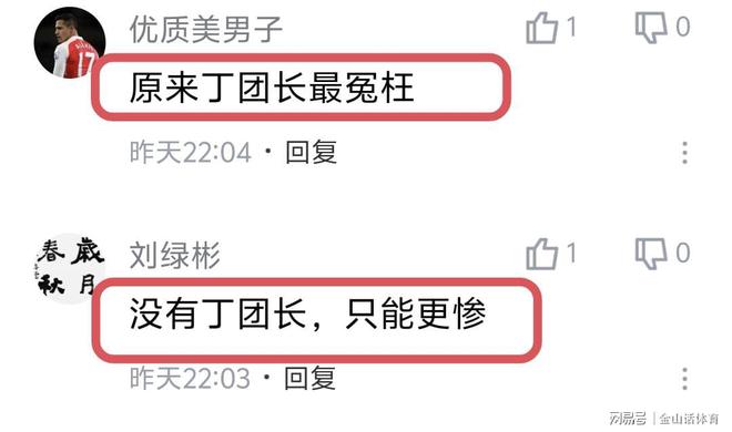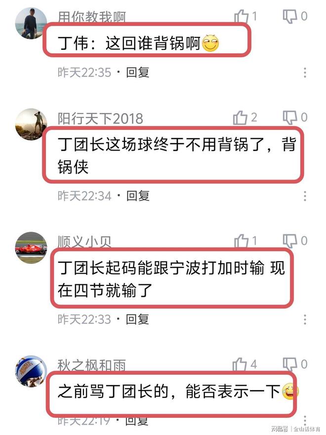 “丁偉:這回誰背鍋啊”;“丁團(tuán)長(zhǎng)這場(chǎng)球終于不用背鍋了,背鍋俠”;“丁團(tuán)長(zhǎng)起碼能跟寧波打加時(shí)輸 現(xiàn)在四節(jié)就輸了”;“之前罵丁團(tuán)長(zhǎng)的,能否表示一下?!?;“原來丁團(tuán)長(zhǎng)最冤枉”;“沒有丁團(tuán)長(zhǎng),只能更慘”……