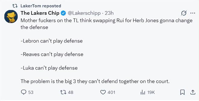 當(dāng)詹姆斯、里夫斯、東契奇三個核心都不能防守時,難道就交易得到一個3D側(cè)翼就能完全改變球隊體系嗎?明顯是癡人說夢。