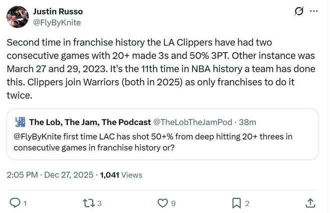 期間快船隊三分命中率超過50%,是球隊第二次連續(xù)2場以50+%三分命中率命中20+三分,也是NBA歷史第11次有球隊做到這一壯舉,快船與勇士則是唯二多次做到這一點的球隊。