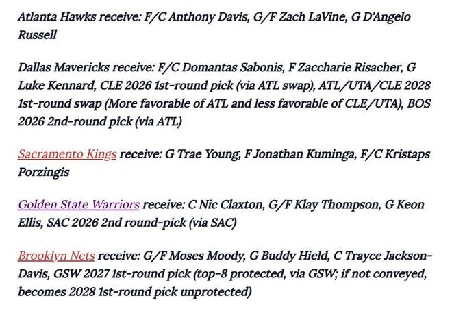 獨行俠得到:小薩博尼斯+里薩謝+肯納德+26年騎士首輪簽(來自老鷹)+28年首輪互換+26年二輪簽;