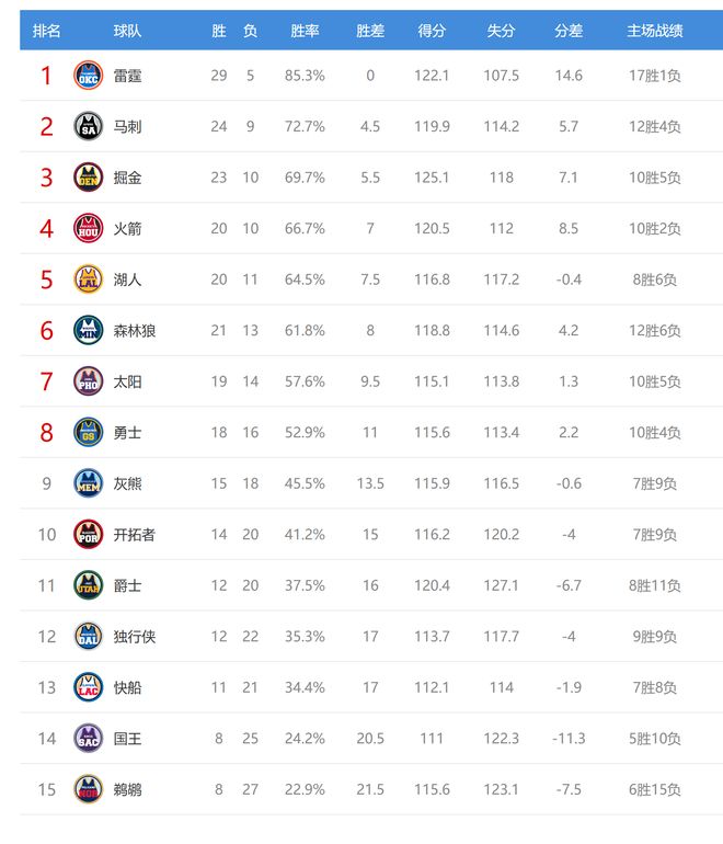 掘金贏球后23勝10負(fù)排名西部第三,領(lǐng)先第四的火箭1.5個(gè)勝場(chǎng)。