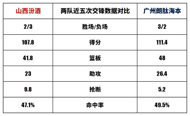 山西汾酒與廣州朗肽海本歷史上一共交手44次,山西汾酒23勝21負。上賽季兩隊交手2次,山西汾酒2勝0負。