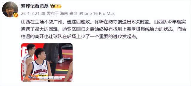 顯然,在賈磊老師看來,山西隊(duì)很困難了,一是迪亞洛今非昔比,一是古德溫離開少了進(jìn)攻點(diǎn)。