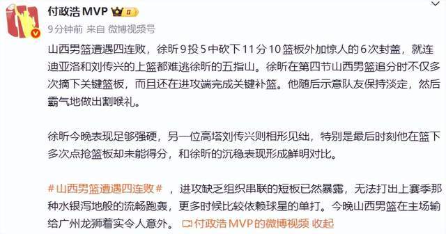 主場(chǎng)爆冷還輸給廣州隊(duì)之后,籃球記者賈磊老師認(rèn)為:山西在主場(chǎng)不敵廣州,遭遇四連敗。徐昕在防守端送出6次封蓋。山西隊(duì)今年確實(shí)遭遇了很大的困難,迪亞洛回歸之后始終沒有找到上賽季極具統(tǒng)治力的狀態(tài),而古德溫的離開也讓球隊(duì)在后場(chǎng)上少了一個(gè)重要的進(jìn)攻發(fā)起點(diǎn)。