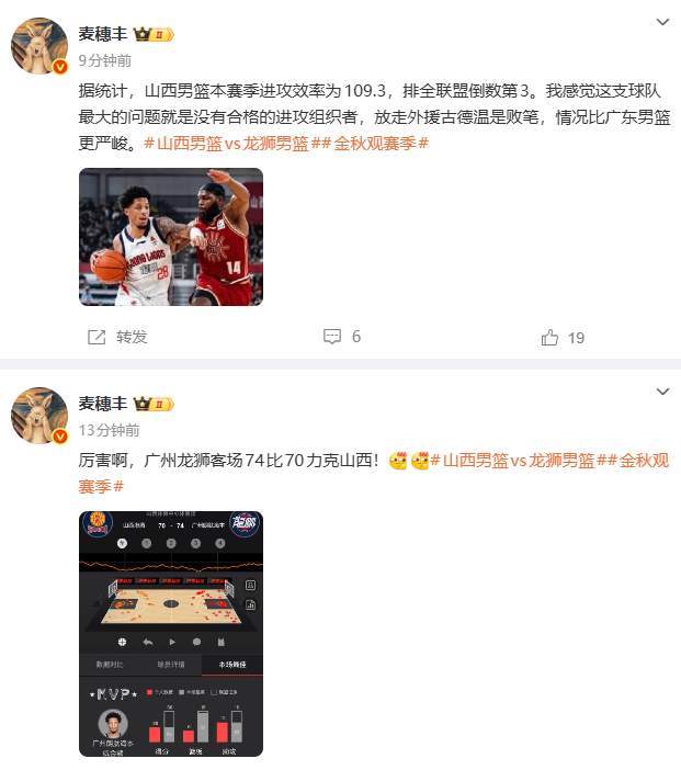 而廣東媒體記者麥穗豐老師則驚呼:厲害啊,廣州龍獅客場(chǎng)74比70力克山西!隨后,麥穗豐老師又表示:據(jù)統(tǒng)計(jì),山西男籃本賽季進(jìn)攻效率為109.3,排全聯(lián)盟倒數(shù)第3。我感覺這支球隊(duì)最大的問題就是沒有合格的進(jìn)攻組織者,放走外援古德溫是敗筆,情況比廣東男籃更嚴(yán)峻。