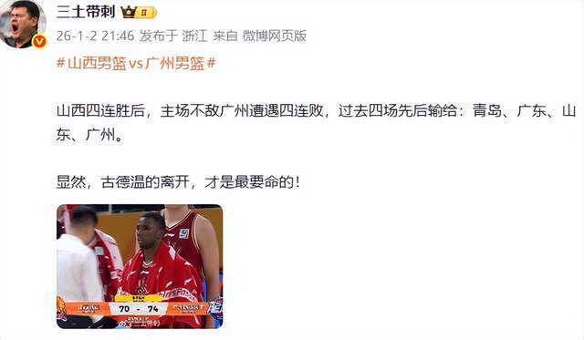 北京媒體人三土帶刺老師則表示:山西四連勝后,主場(chǎng)不敵廣州遭遇四連敗,過去四場(chǎng)先后輸給:青島、廣東、山東、廣州。顯然,古德溫的離開,才是最要命的!