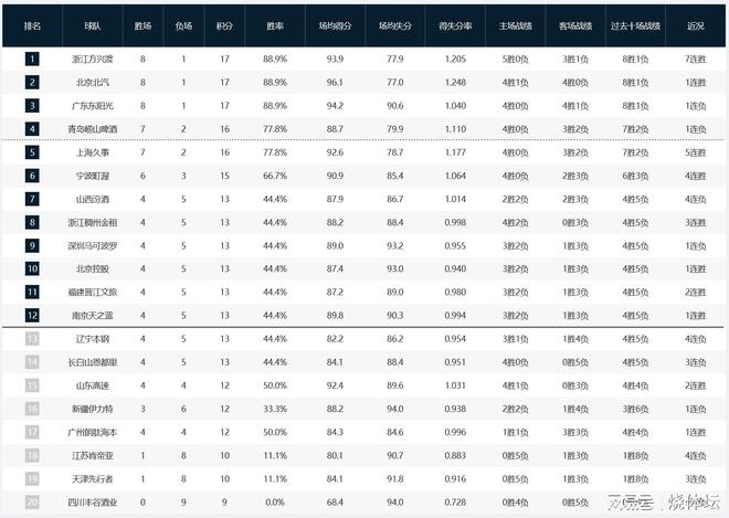 此外,近期遼寧、新疆等球隊的表現(xiàn)都比較低迷,目前排名相對來說都不高。寧波、浙江等呈現(xiàn)出不錯的上升勢頭,排名節(jié)節(jié)攀升。此外,四川男籃仍未拿到賽季首勝。