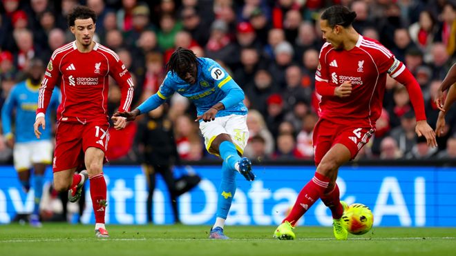 第26分鐘,利物浦卷土重來,麥卡利斯特的勁射同樣擊中立柱,但裁判吹罰基耶薩在門前干擾了若澤薩,越位在先。