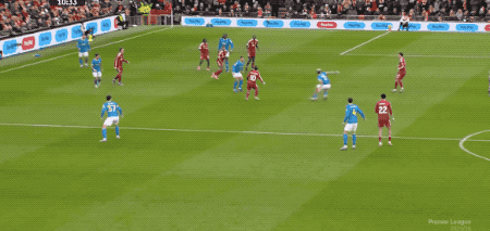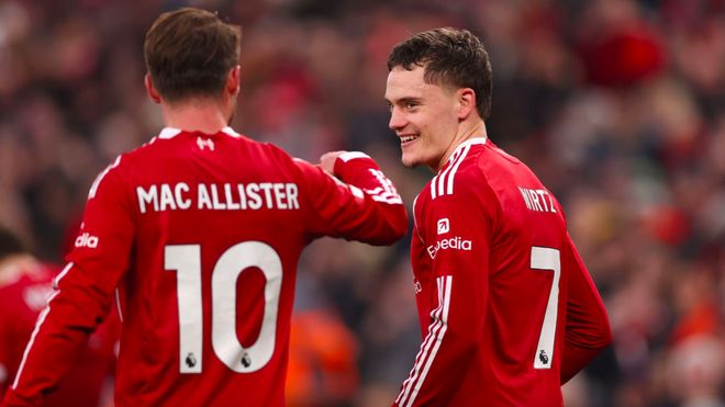 利物浦主場球迷起立歡呼,畢竟,這是1.36億歐元加盟的維爾茨代表利物浦23場比賽打進的第一個進球。