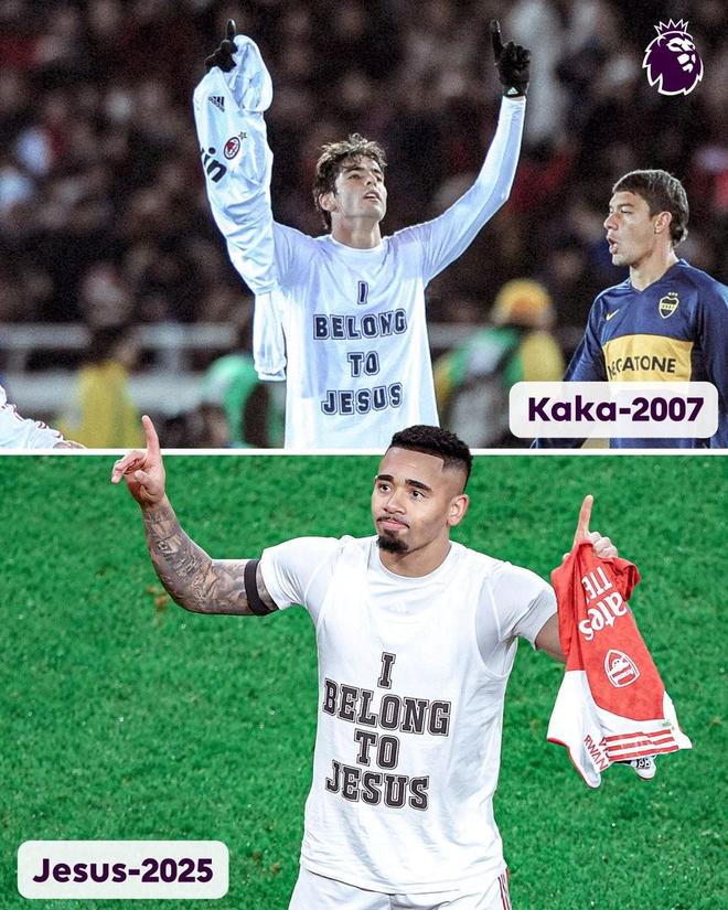 進球后,熱蘇斯做出了卡卡同款的進球動作,而且他的內(nèi)襯上也同樣寫著“我屬于耶穌”。當(dāng)然這句話也可以雙關(guān),翻譯為“我屬于自己”,因為熱蘇斯與耶穌同名。