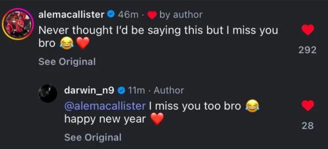 結(jié)束2025年后,努涅斯在社交媒體上上曬圖回顧這一年,而他的前隊友麥卡利斯特則在評論區(qū)表示想他了。