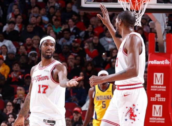 伊森首發(fā)+芬尼史密斯替補(bǔ),火箭確保了全場比賽都有防守壓迫性的存在,謝潑德身邊有人保護(hù),他進(jìn)攻端的威脅才能最大化。第三,正如我們開頭說的那樣,這三場大勝,火箭和快船四連勝本質(zhì)上問題相同,快船是因?yàn)樽姘痛牡氖軅?,?nèi)線空間被打開后,倫納德火力全開;杜蘭特則是因?yàn)闆]有人搶奪球權(quán),他得以用最高效的方式完成終結(jié),直白點(diǎn)說,沒有球權(quán)停頓,流暢輸送到杜蘭特手中。等到申京回歸,烏度卡如何平衡這一點(diǎn)是難題。