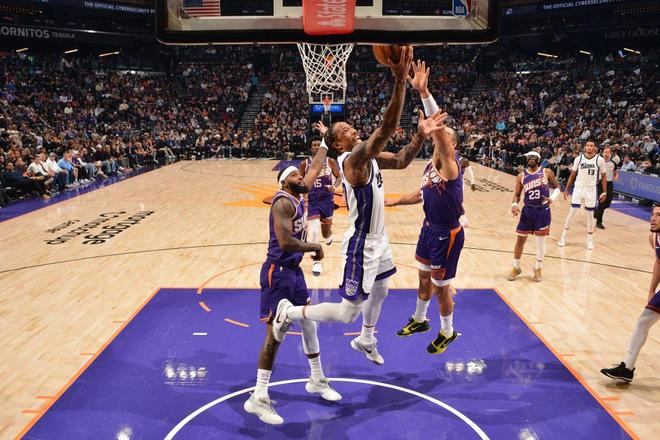 中場休息回來,太陽連續(xù)三節(jié)單節(jié)得分30+,且完成首次單節(jié)得分35+,還限制國王連續(xù)三節(jié)得分不足30分。太陽內(nèi)外開花率先擴大75-61領(lǐng)先優(yōu)勢,并在之后擴大88-70領(lǐng)先優(yōu)勢,國王略有反撲追分,太陽單節(jié)35-27凈勝8分,三節(jié)結(jié)束太陽擴大97-83領(lǐng)先國王。前三節(jié)比賽,國王三分21中8,穆雷23+8、德羅贊13分與施羅德10分,威少9中3僅得到6+8+6;太陽三分25中7,布克21中13得到33分與狄龍18分,引領(lǐng)太陽4人得分上雙。