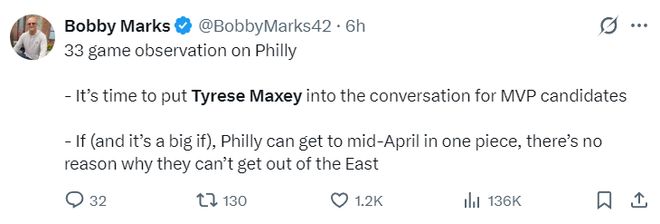 ESPN薪資結(jié)構(gòu)專家鮑比-馬克斯:是時(shí)候?qū)ⅠR克西納入MVP候選人行列了,假設(shè)費(fèi)城進(jìn)入4月中旬全隊(duì)都保持健康,那么他們沒有理由不沖出東部。