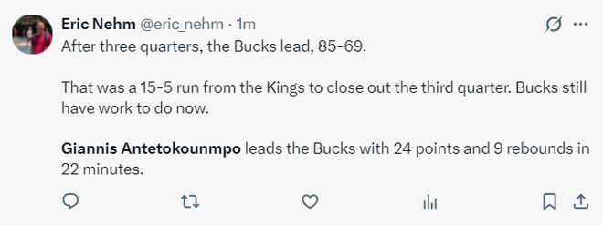 上半場打完雄鹿已經領先國王18分,第三節(jié)兩隊就是對攻了,揚尼斯單節(jié)7分鐘5中3拿到9分3籃板1助攻,三節(jié)揚尼斯僅出戰(zhàn)22分鐘不到。