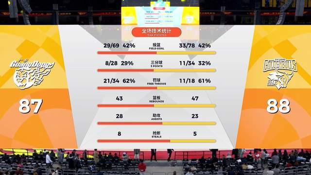 徐杰復(fù)出14投7中,空砍22分2籃板1助攻2搶斷,胡明軒11投3中,拿到10分7籃板4助攻,奎因16投7中,拿到17分10籃板7助攻2搶斷,薩姆納17分6助攻,薩林杰啞火,8投2中,只拿到6分5籃板6助攻。