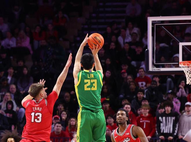 出戰(zhàn)33分鐘,14投8中,三分球12中6,罰球2中1,轟下23分1籃板5助攻2搶斷,林葳不經意間迎來了NCAA生涯之夜,他的上場時間、得分、助攻、搶斷、三分命中數(shù)都創(chuàng)造了新高。1月6日,俄勒岡大學歷經加時賽以85比88不敵羅格斯大學,林葳在這一戰(zhàn)表現(xiàn)神勇。