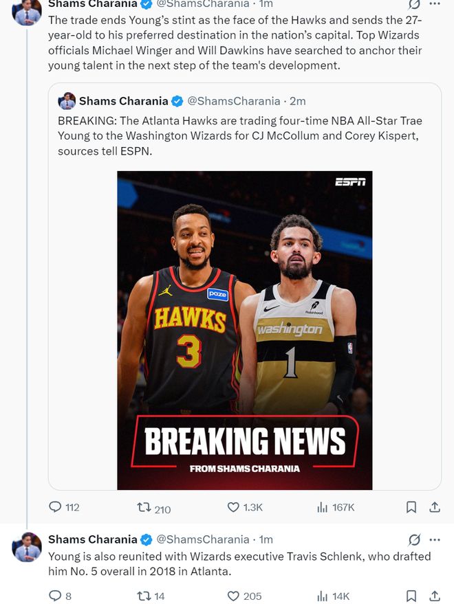 北京時間1月8日,根據(jù)ESPN記者Shams的報道,奇才與老鷹達成交易,老鷹將特雷楊送到奇才換取麥科勒姆、基斯珀特,這筆交易只是1換2,換言之特雷楊的交易價值是負面的。