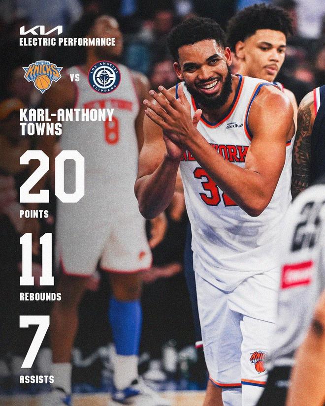 尼克斯隊內(nèi)線巨頭卡爾安東尼唐斯,在此役表現(xiàn)突出。唐斯上場31分鐘,18投6中,三分球4投0中,罰球10中8,得到了20分11板7助攻1搶斷1蓋帽。唐斯效率并不理想,僅有33%的命中率,三分球則是顆粒無收。