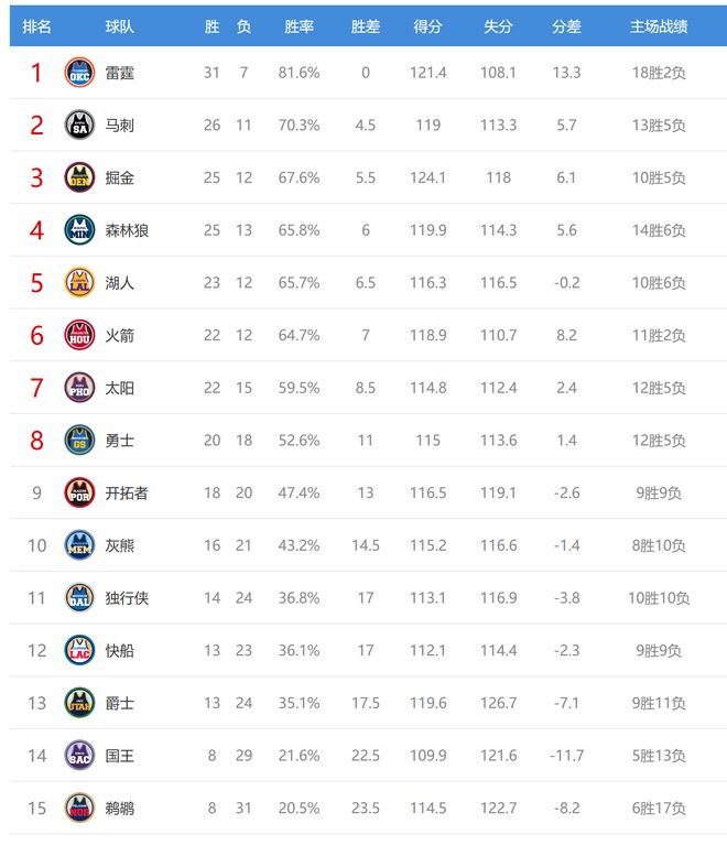 今日比賽后森林狼、湖人排名互換,其他西部球隊(duì)排名不變。