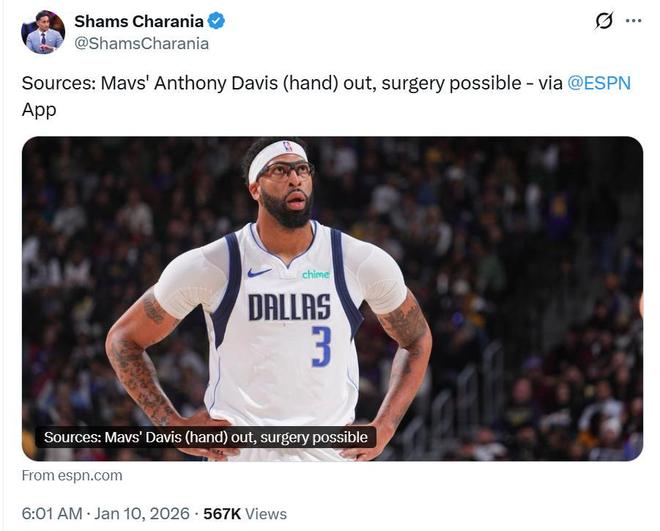 名記Shams后續(xù)在與Tim MacMahon的聯(lián)合報(bào)道中也指出這一點(diǎn),表示濃眉哥這一次突如其來的傷病讓其交易前景變得更加復(fù)雜。