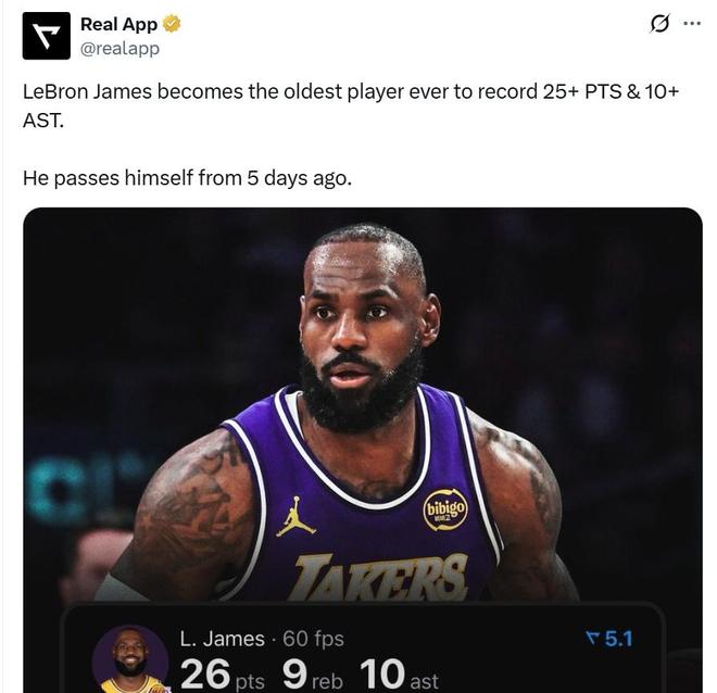 憑借這樣的表現(xiàn),41歲零11天的詹姆斯也超越5天前的自己,成為NBA歷史上單場拿到至少25+10助最老的球員。