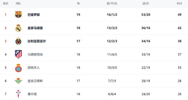 在積分榜上,巴薩的戰(zhàn)績是16勝1平2負,拿到49分排名榜首。皇馬以42分排名第2。皇馬在少賽一場的情況下落后巴薩7分。比利亞雷亞爾贏球后,暫時升到了第3名,總積分是38分。而馬競則以37分掉到第4名。第5的是西班牙人,拿到了33分?;始邑惖偎挂?8分排名第6。