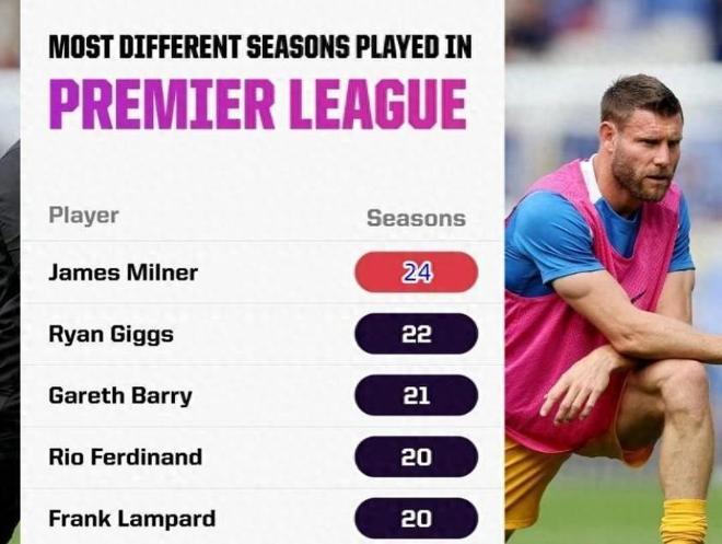 在英超賽場(chǎng)上踢了25個(gè)自然年,40歲的米爾納距離英超歷史出場(chǎng)王僅一步之遙!