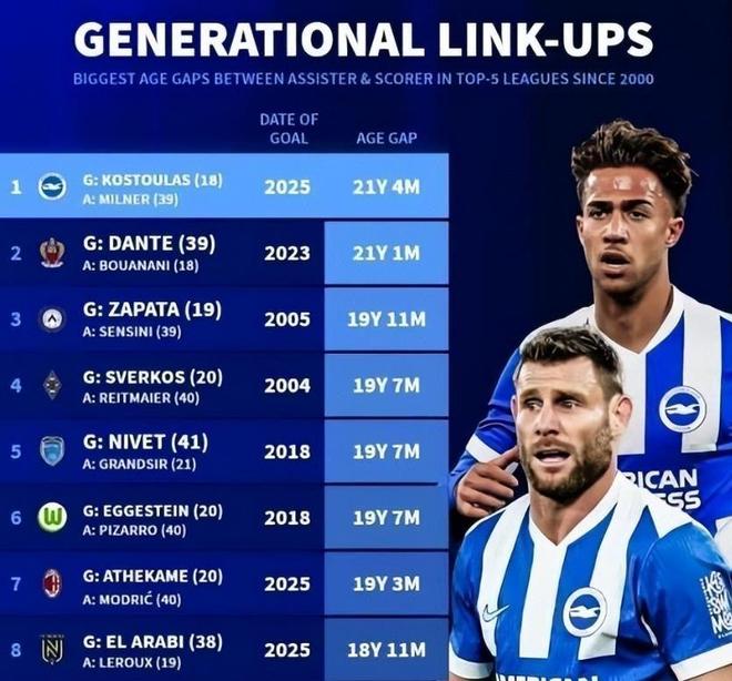 進(jìn)球本身并未改變比賽結(jié)果,卻創(chuàng)造了歐洲五大聯(lián)賽前無古人的紀(jì)錄。21年4個(gè)月的年齡差,這個(gè)“一老一少”的連線組合,成為五大聯(lián)賽歷史上年齡差最大的進(jìn)球組合。命運(yùn)的安排有著奇妙的對(duì)稱感,當(dāng)2002年11月10日,16歲的米爾納身披利茲聯(lián)戰(zhàn)袍打進(jìn)英超處子球時(shí),他如今助攻的這位年輕隊(duì)友,甚至尚未降臨人世。