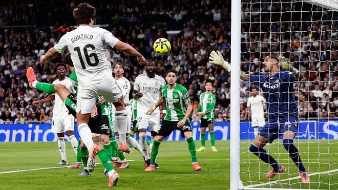 在貢薩洛之前,皇馬上一個(gè)能夠在西甲賽場(chǎng)上演“完美帽子戲法”(即左右腳和頭球各攻入一球)的球員,還要追溯到2018年的C羅。出身皇馬青訓(xùn)的貢薩洛本場(chǎng)只是第一次在西甲賽場(chǎng)進(jìn)球,便上演如此神跡。貢薩洛本場(chǎng)的帽子戲法含金量相當(dāng)高,他先是接到羅德里戈開(kāi)出的任意球,頭球首開(kāi)紀(jì)錄,用最簡(jiǎn)潔的方式為皇馬打開(kāi)勝利之門。下半場(chǎng)伊始,在貝蒂斯調(diào)兵遣將意圖扳平比分之際,又是貢薩洛干脆利落的右腳抽射破門,為皇馬基本鎖定勝局。最后時(shí)刻貢薩洛在禁區(qū)內(nèi)左腳腳后跟精妙破門,徹底讓伯納烏沸騰,這位小將第一次在伯納烏球場(chǎng)有了巨星級(jí)別的待遇,全場(chǎng)球迷高唱他的名字,并在他被換下時(shí)送上整齊的掌聲。