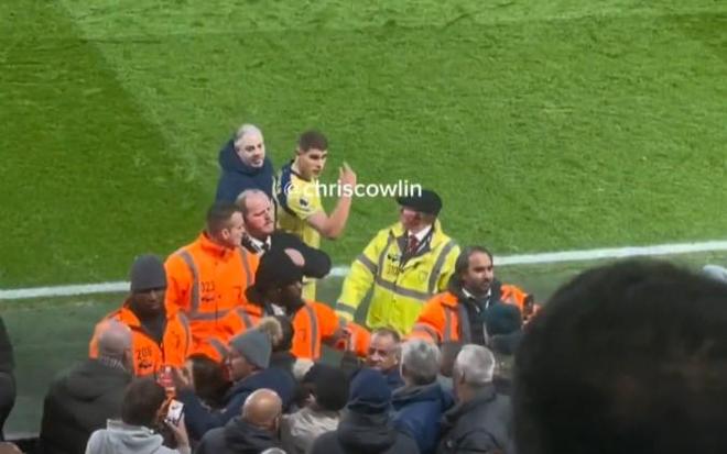 這位從拜仁慕尼黑租借而來(lái)的中場(chǎng)球員翻過(guò)廣告牌,與憤怒的熱刺死忠進(jìn)行了交流。
