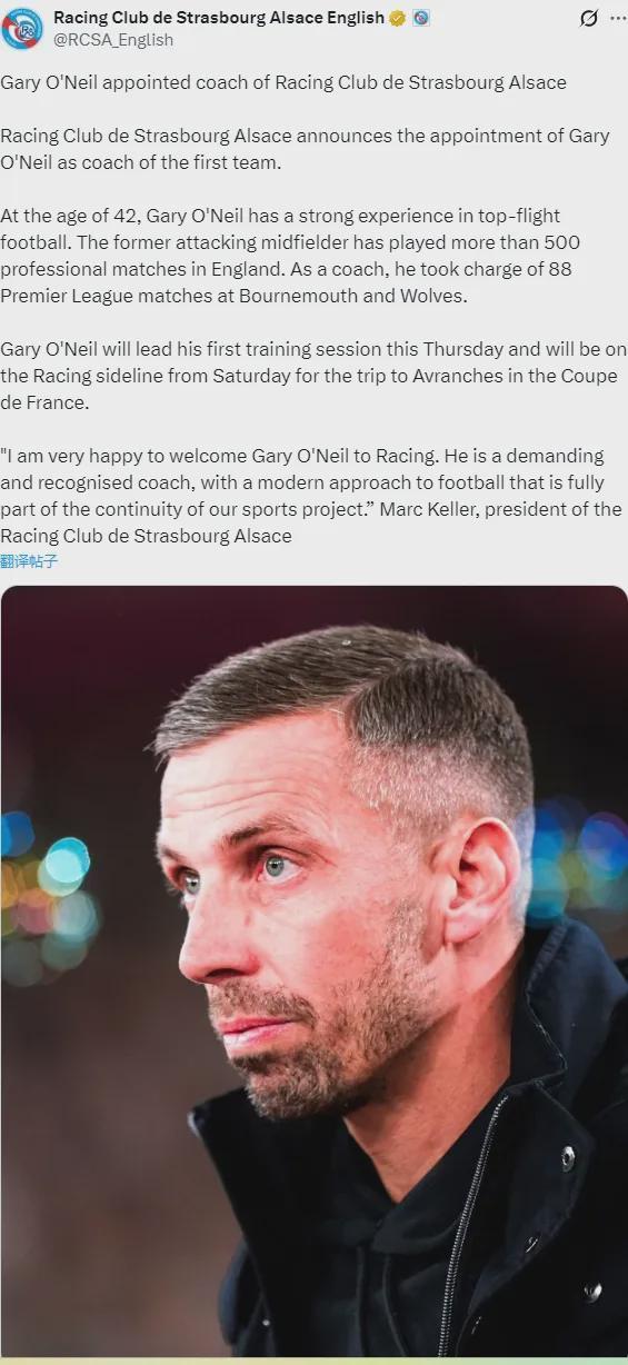 官方:斯特拉斯堡宣布任命加里-奧尼爾為俱樂部新主帥。