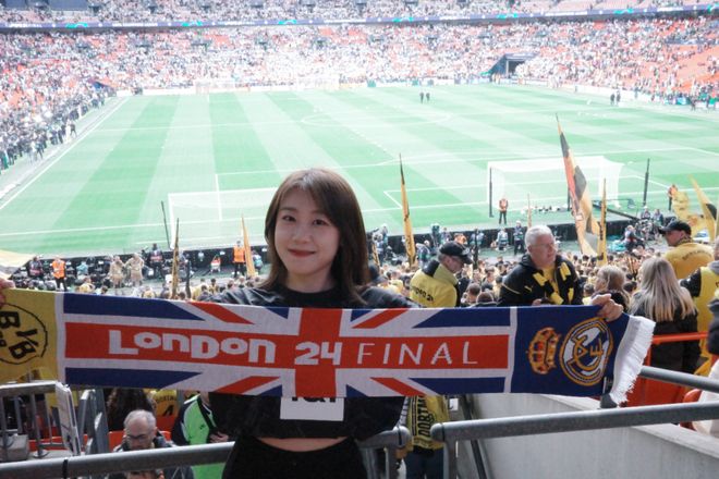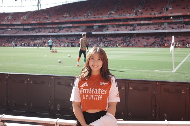 A:我叫菲菲,是一名95后女球迷,出生在山東濟(jì)南。我的俱樂(lè)部主隊(duì)是阿森納,因?yàn)楝F(xiàn)在在倫敦工作,所以每到世界杯或大賽,我也會(huì)選擇支持英格蘭。我和足球的最初記憶其實(shí)非常生活化。小時(shí)候的夏夜,會(huì)跟著爸爸去濟(jì)南的燒烤攤看世界杯,老電視、小板凳,還有一群陌生卻因?yàn)樽闱蜓杆贌峤j(luò)起來(lái)的大人們。現(xiàn)在回想起來(lái),那些畫(huà)面都還是特別珍貴的記憶。中學(xué)時(shí),班里大部分同學(xué)都是皇馬和C羅的球迷,每天都能聽(tīng)到朋友們聊足球,我們也會(huì)一起去看山東泰山的主場(chǎng)比賽。上大學(xué)之后,我更多是看世界杯和歐洲杯,不太會(huì)熬夜追聯(lián)賽。直到去英國(guó)讀書(shū),才和室友們一起關(guān)注英超的各種動(dòng)向。但真正的轉(zhuǎn)折點(diǎn),是去年正式來(lái)到倫敦工作,我才開(kāi)始盡量一場(chǎng)不落地走進(jìn)球場(chǎng)支持自己的主隊(duì)。截至目前,我已經(jīng)在現(xiàn)場(chǎng)看過(guò)45場(chǎng)比賽,這種連接是過(guò)去十幾年隔著屏幕無(wú)法比擬的。我想我這輩子都會(huì)是阿森納球迷了。